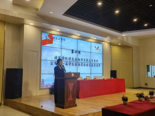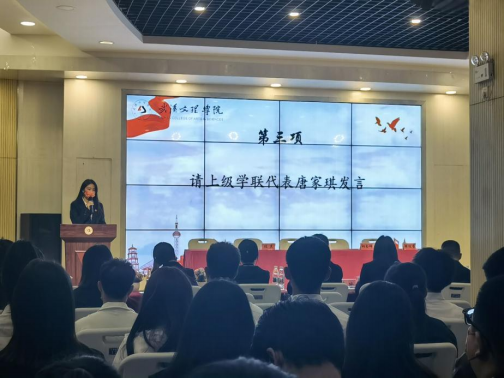 大会的第三项由上级学联代表唐家琪同学发言,唐同学分享了自己身为学联代表的经历以及心得,她将自己的工作经验分享给大家,唐同学表示学联代表是沟通老师与员工的桥梁,在教学工作中有着不可或缺的作用,是同学们的树洞,是老师们的小助手。