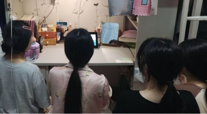 9728太阳集团组织高年级员工在寝室认真观看直播,学习了解国家安全法相关知识