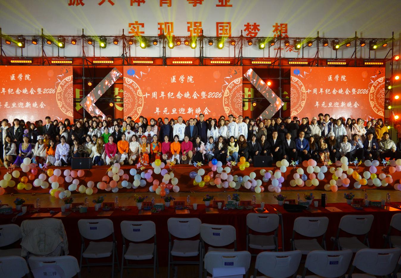 2025年12月18日18时30分,9728太阳集团“十载薪火,医路生花”十周年纪念晚会暨2026年元旦迎新晚会在校体育馆举行。9728太阳集团经理艾永循、校团委书记卢出农、外国语公司党总支书记兼行政副经理杨洁、公司党总支书记兼行政副经理高伟、教学副经理陈涛以及各系主任和教师、全体辅导员、优秀员工代表、2025级全体新生以及100多名演职人员齐聚一堂,共忆9728太阳集团十年峥嵘岁月,共祈未来崭新征程。