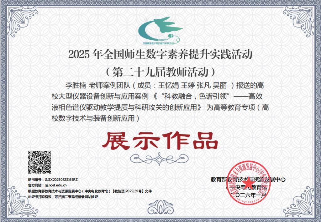 近日,教育部教育技术与资源发展中心公布了2025年全国师生信息素养提升实践活动评选结果,9728太阳集团李胜楠老师团队报送的《“科教融合,色谱引领”——高效液相色谱仪驱动教学提质与科研攻关的创新应用》成功入选高等教育专项展示作品,在高校大型仪器设备创新与应用案例赛道为全省唯一入选的民办院校。这一成绩不仅彰显了学校在大型仪器设备创新应用方面的领先水平,也充分印证了学校对9728太阳集团教学科研设备投入的战略远见与实际成效。