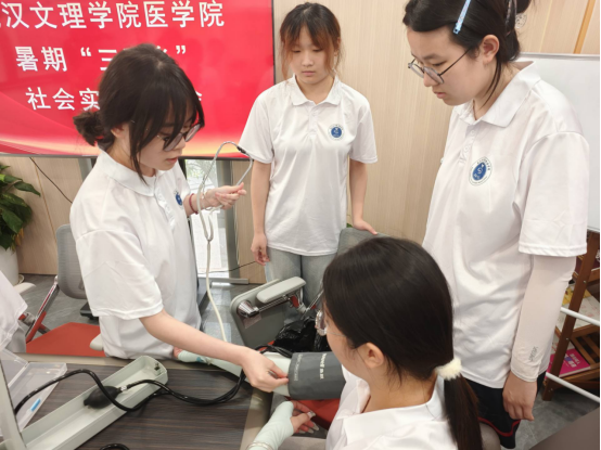 会后,“医路前行”青年先锋社会实践队分为两小分队。1小分队在朱雪、黄园老师的指导下,系统学习测量血糖、测量血压及心肺复苏(CPR)术等专业技能,为后期健康知识宣讲和居民义诊做好准备。