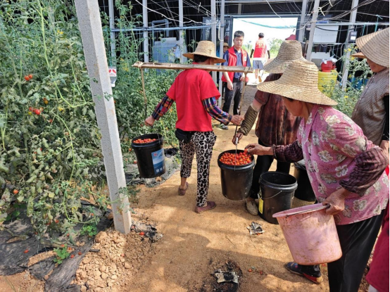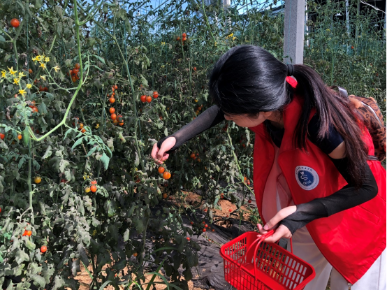 实践队员在果农的指导下抢摘葛店镇长咀果蔬大棚生态采摘园的蔬菜果实,确保果蔬及时收货