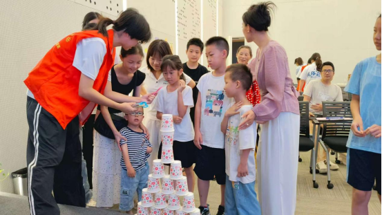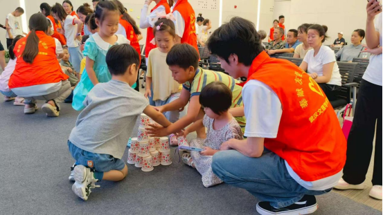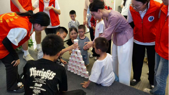 实践队员现场组织孩子们进行趣味团队游戏,小朋友们踊跃参与。