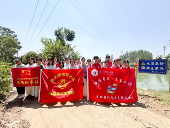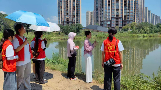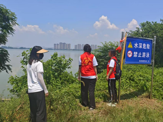 在湖边巡湖与防溺水宣传环节,实践队队员与社区工作人员分为两组,分别前往严家湖的两个湖区进行巡查。据悉,为保障暑期安全,该区域安排专人管理,每隔两小时就会进行一次巡查。社区负责人向实践队队员们们介绍,此前长江堤放水时,社区还在路口设置样板房开展防溺水宣传,多措并举筑牢安全防线。